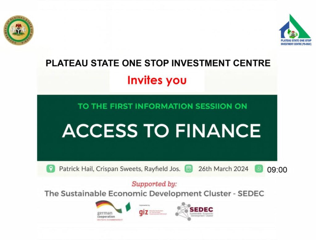 The Plateau State One Stop Investment Centre (PS-OSIC), in collaboration with PLASMIDA, the Bank of Industry, and other financial institutions, with the support of GIZ/SEDIN, invites key stakeholders and associations to an information session on access to credit for Micro, Small, and Medium Enterprises (MSMEs) in Plateau State.