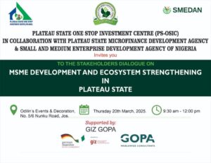 The Plateau State One Stop Investment Centre (PS-OSIC), in collaboration with the Plateau State Micro, Small and Medium Enterprises Development Agency (PLASMIDA) and the Small and Medium Enterprises Development Agency of Nigeria (SMEDAN), supported by GIZ/GOPA, convened the MSME Ecosystem Engagement on Thursday, 20th March 2025, at ODILIN’S Events and Decorations, Jos.